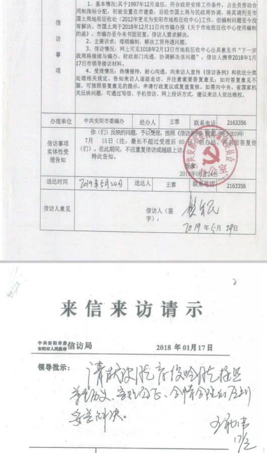樊军民的维权之路,与信访程序紧密交织。2019年5月16日,他因“理顺编制、解决工资待遇”信访,中共安阳市委编办出具《信访事项受理告知书》,明确“于2019年7月15日前办结并书面答复”。但这份承诺,最终成了一纸空文。